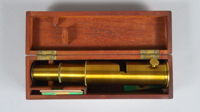 Microscope en laiton dans son coffret en acajou et visionneuse en acajou avec une série de plaques photographiques