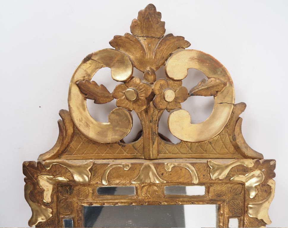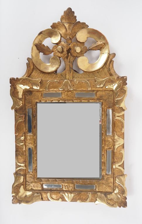 Miroir à parecloses fin XIXème - début XXème en bois et stuc doré à décor d'agraffes et de rinceaux feuillagés, fronton ajouré à décor de fleurs et de palmes. Dim. 68 x 40 cm.