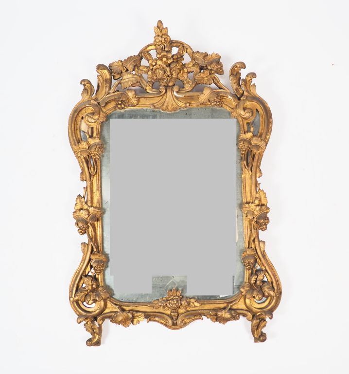 Miroir à parecloses Louis XV en bois et stuc doré, à décor de rinceaux, de coquilles et de fleurs. Dim. 115,5 x 77 cm