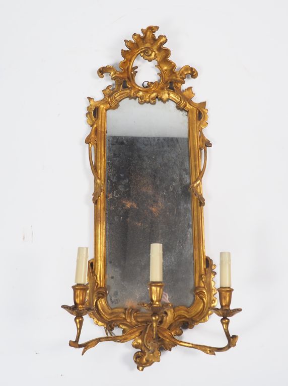 Miroir d'applique début XIXème de style Rocaille en bois et stuc doré, éclairant à trois lumières. Dim. 91 x 37 cm