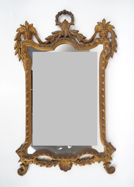 Miroir de style Louis XVI en bois et stuc doré, à décor de feuillage. Dim. 75 x 45 cm