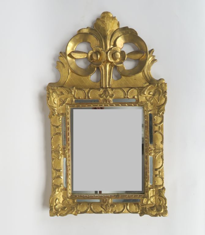 Miroir Louis XV en bois sculpté et doré, à décor de fleurons et de rinceaux, fronton ajouré orné de rocailles et de fleurs. Dim. 75 x 44 cm