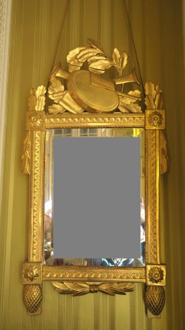 Miroir Louis XVI en bois sculpté et doré (redoré), à décor de feuillage et de rais de cœur, surmontée d’un petit fronton ajouré orné d’un trophée d’instruments de musique 101 x 52 cm