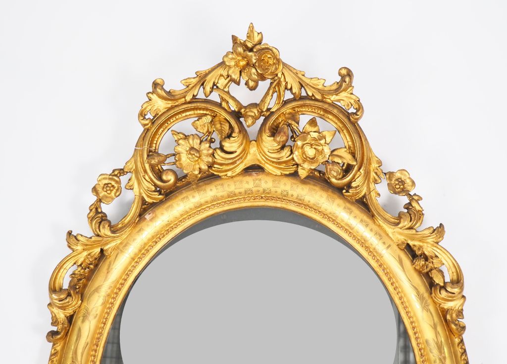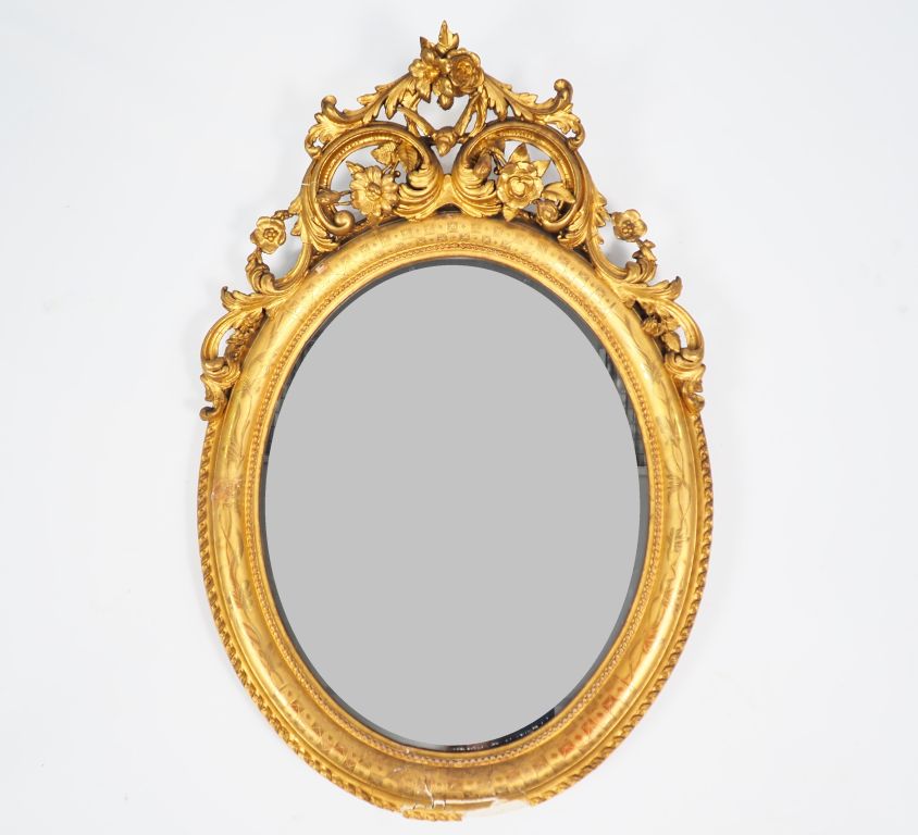 Miroir médaillon Napoléon III en bois et stuc doré surmonté d'un fronton ajouré à décor de rocailles et de fleurs. Dim. 110 x 83 cm (petit accident)