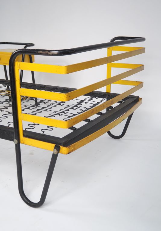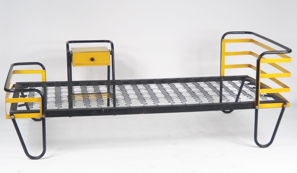 Mobilier de chambre à coucher 1950 en métal laqué jaune et noir comprenant : un lit et un chevet.
