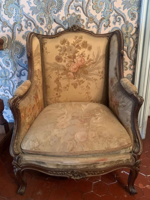Mobilier de salon 1900 de style Louis XV comprenant : une paire de bergères à oreilles et quatre chaises.