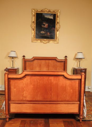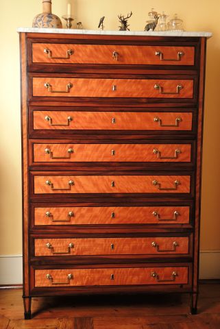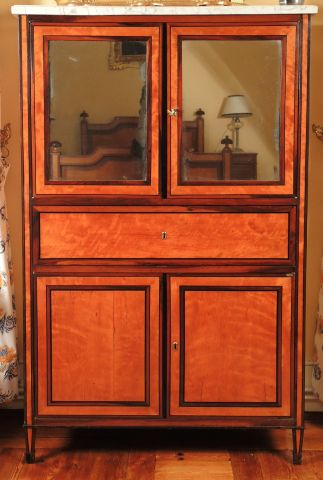 Mobilier Louis XVI en marqueterie de citronnier, palissandre, acajou et filets d’ébène marqueté, comprenant : un chiffonnier, dessus marbre blanc, ouvrant à huit tiroirs, un secrétaire, ouvrant à deux portes en partie supérieure, un tiroir basculant formant écritoire en partie médiane et deux vantaux en partie inférieure , une grande commode, ouvrant à quatre tiroirs sur quatre rangs, ornementation de bronze et dessus marbre blanc, pieds fuselés, un lit avec un chevet assorti ouvrant à un rideau à lamelles et une porte