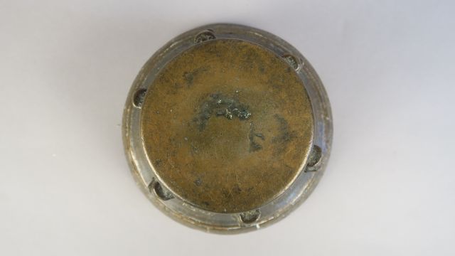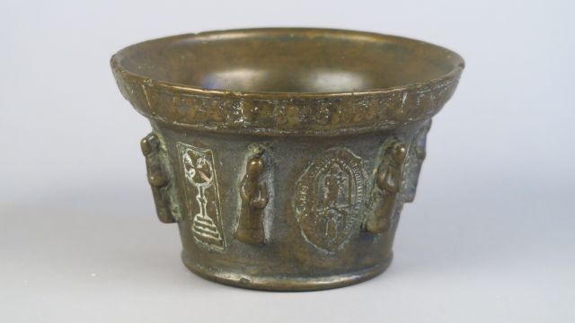 Mortier de style Haute Epoque en bronze, à décor de personnages en haut relief H. : 10.5 cm