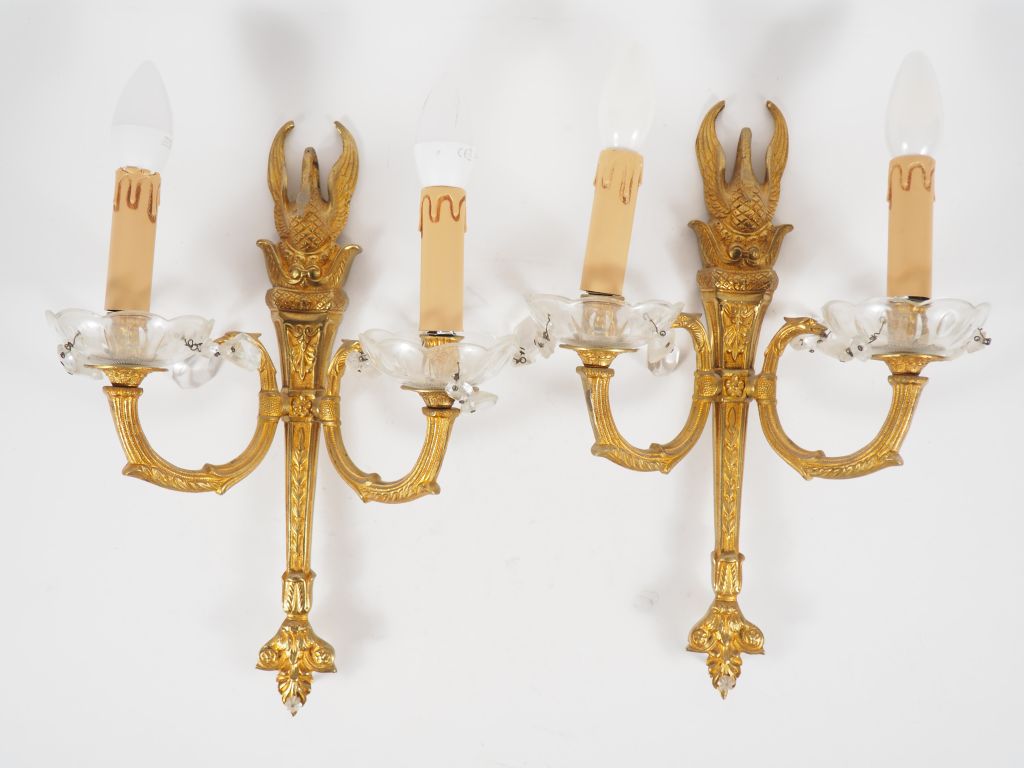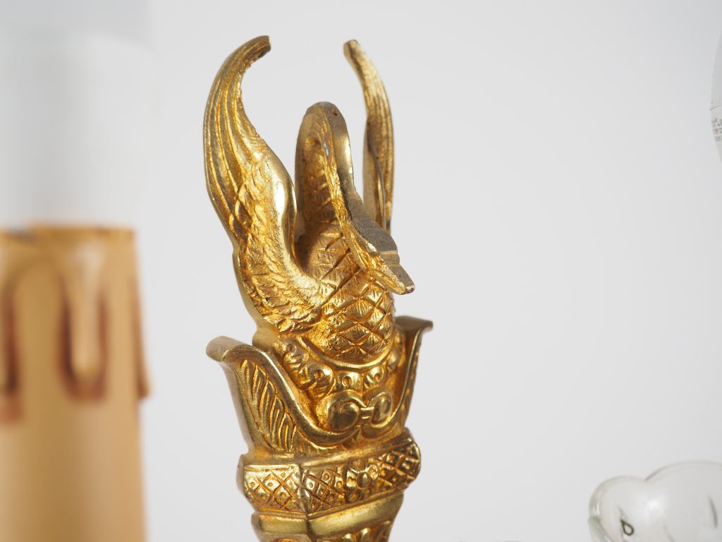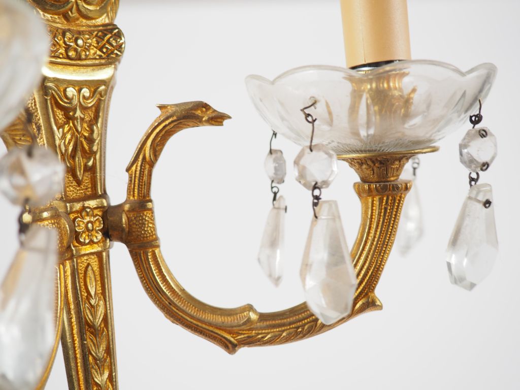 Paire d'appliques doubles à pampilles de style Empire en métal doré, à décor de cygne. H. 40,5 cm