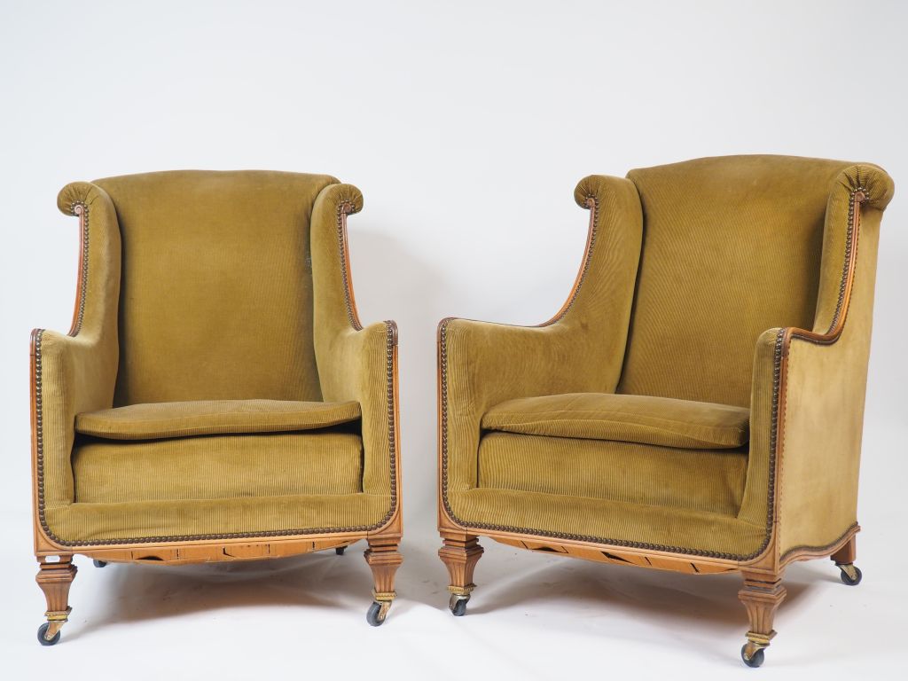 Paire de bergères à oreilles 1900, garniture de velours vert amande. (usures)