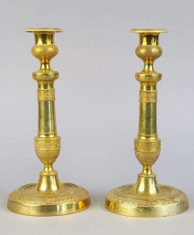 Paire de bougeoirs en laiton, à décor gravé