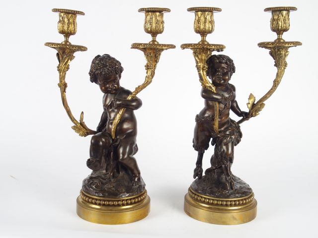 Paire de bougeoirs Napoléon III de style Louis XVI en bronze patiné et doré "Faune", éclairant à deux lumières. H. : 36 cm