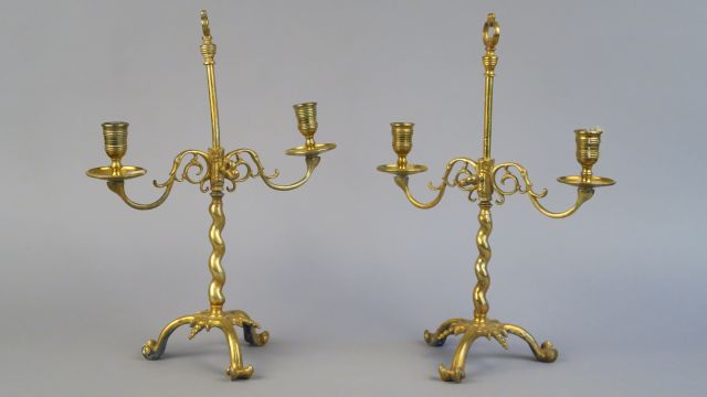 Paire de candélabres en bronze, éclairant à deux lumières, piètement tripode