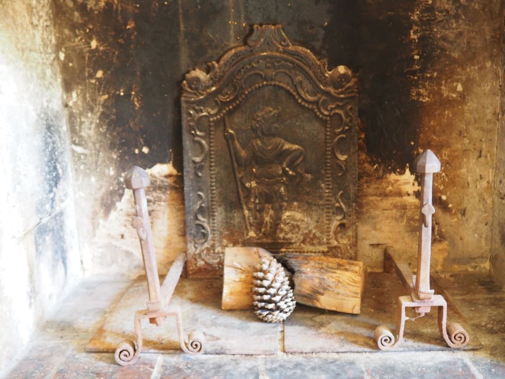Paire de chenets en fer forgé et une plaque de cheminée en fonte à décor d'un personnage.