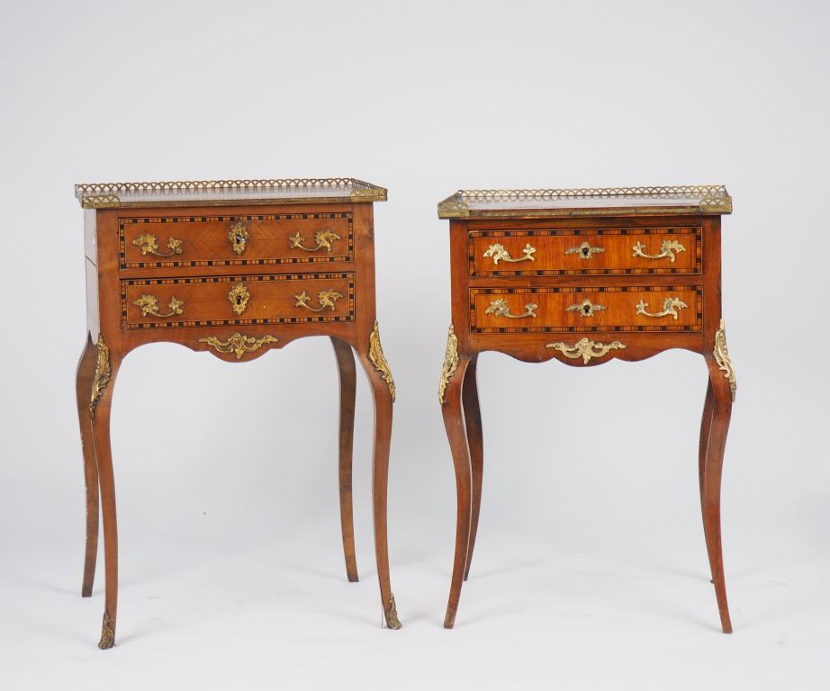 Paire de chevets de style Transition Louis XV-Louis XVI en marqueterie, ornementation de bronze. Dim. 73 x 48,5 x 36 cm
