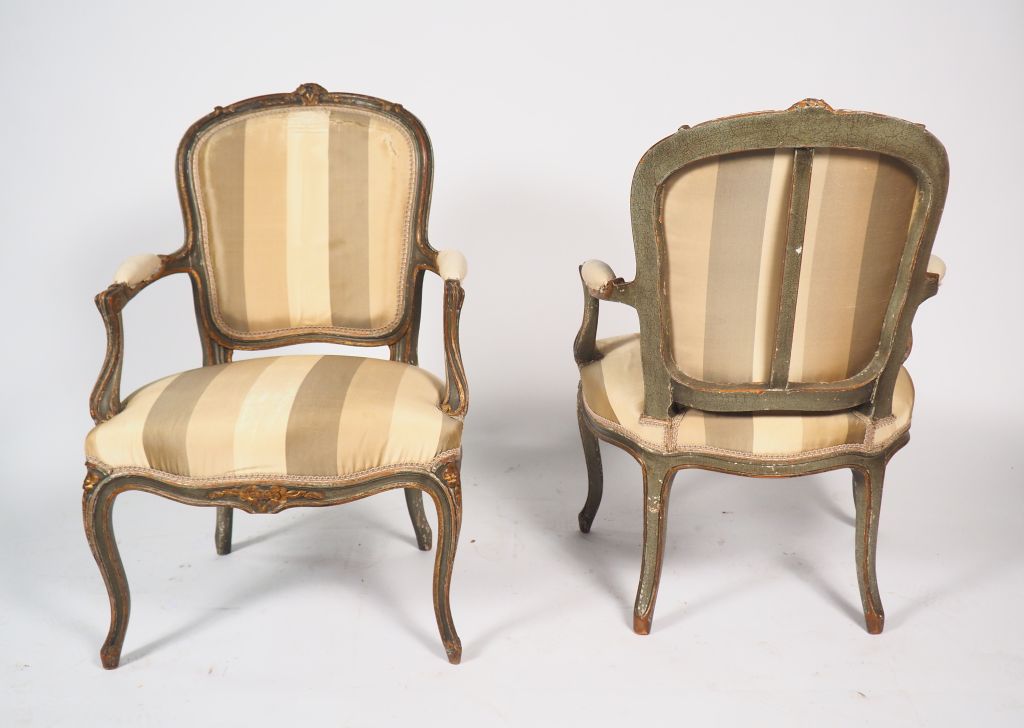 Paire de fauteuils cabriolet, de style Louis XV en bois laqué vert, garniture de tissu usé