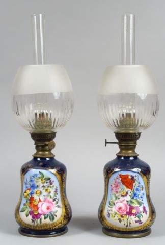 Paire de lampes à pétrole Napoléon III en porcelaine de Valentine, à décor de fleurs polychromes dans des réserves sur fond bleu de four rehaussé d’or