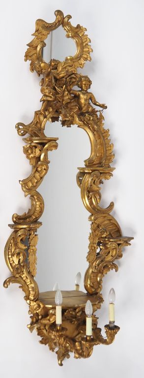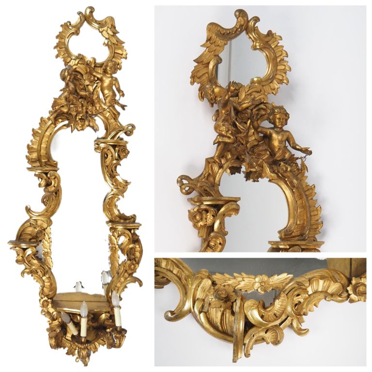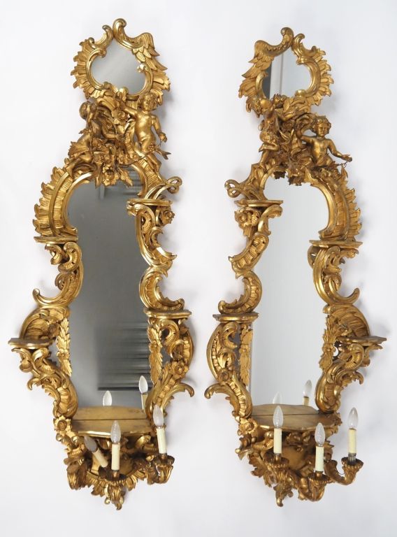 Paire de miroirs de style baroque italien en bois sculpté et doré, à décor d'amours, de rocailles, de fleurs et de feuillage , éclairant à trois lumières. H. 175 cm (petits sauts de dorure et petits manques)