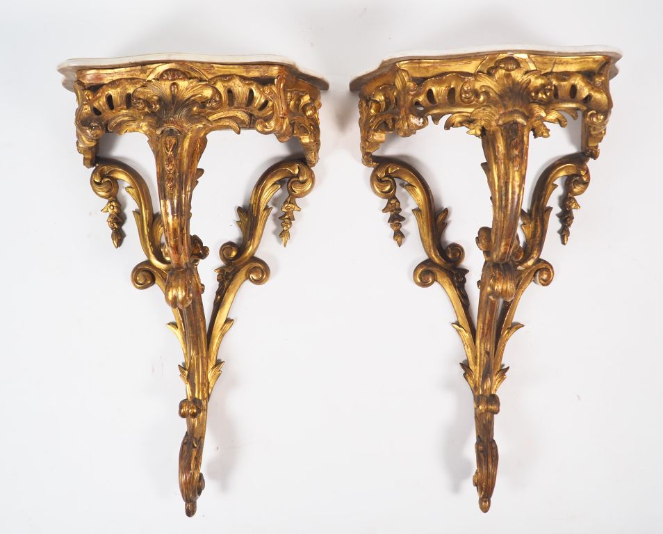 Paire de petites consoles Régence, en bois sculpté et doré, à décor ajouré de rinceaux feuillagés, de coquilles et de feuilles d'acanthe, plateaux marbre blanc postérieurs. H. 97,5 cm (Manques et restaurations).