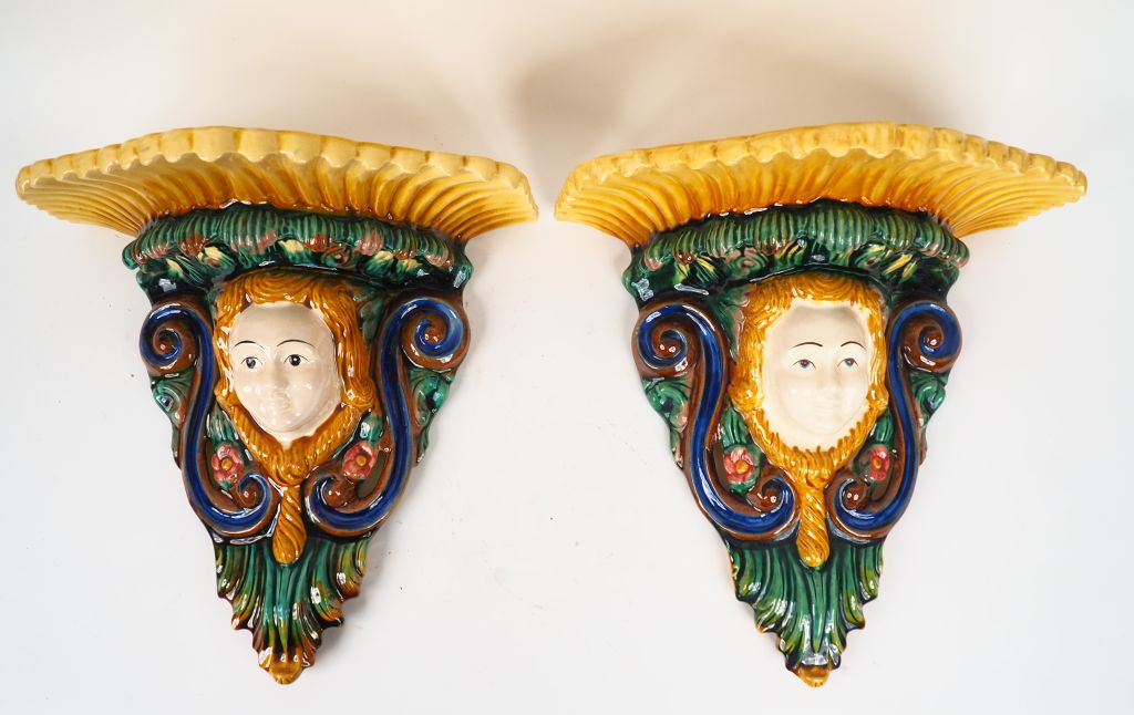 Paire de sellettes d'appliques en céramique polychrome de style italien. Dim. 43 x 43 x 27,5 cm