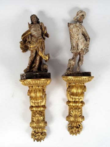Paire de sujets XVIIIème en bois sculpté et doré "Saint Jean-Baptiste" et "Saint Roch", sur deux consoles d'applique en bois sculpté et doré (manques et accidents). H. : 58,5 cm