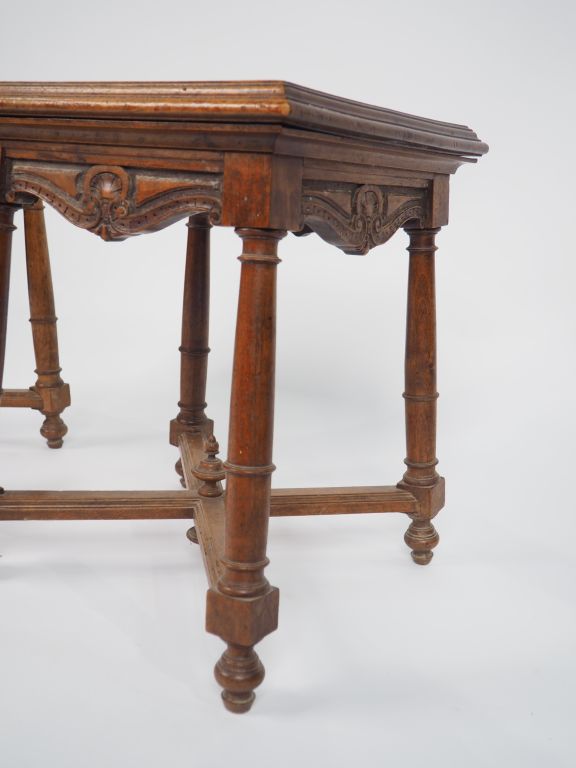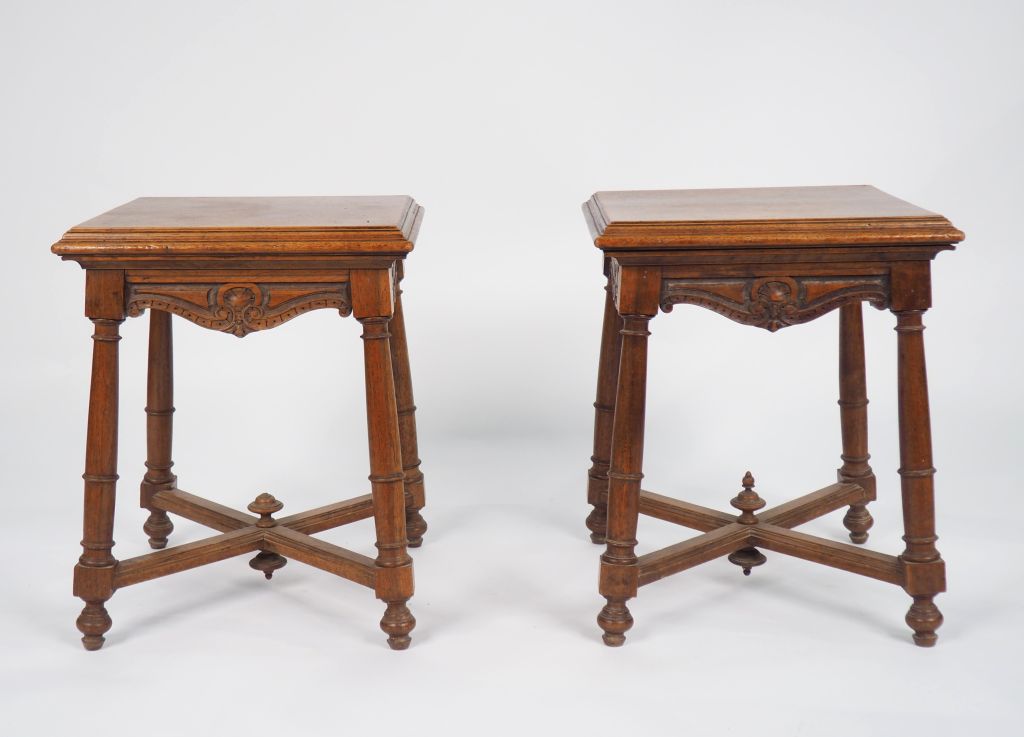 Paire de tabourets de style Henri II en noyer mouluré et sculpté, pieds annelés réunis par une entretoise en X. Dim. 50 x 40,5 x 40cm