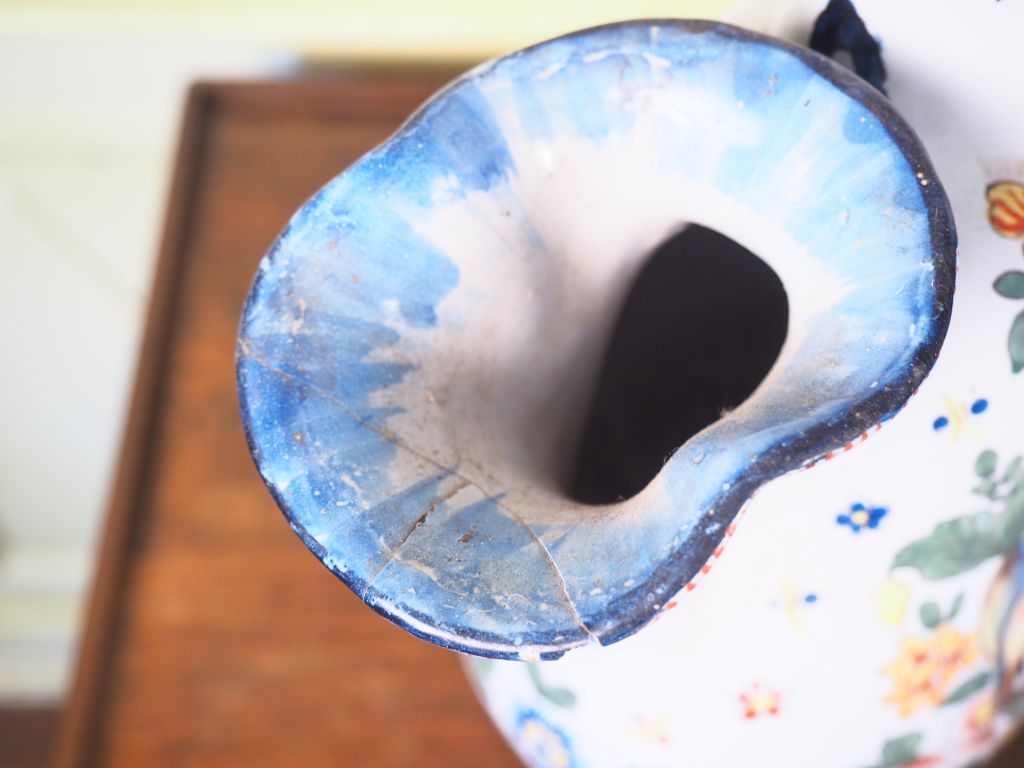Paire de vases en faience polychrome de St-Clément à décor de style rouennais, porte tulipes en faience polychrome de Quimper H. 35,5 cm. (Restaurations).