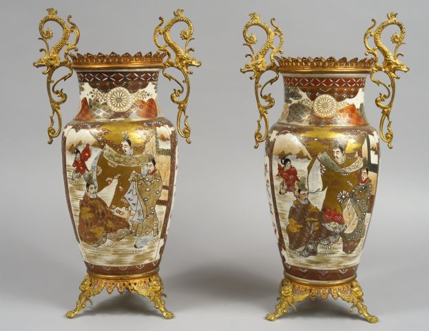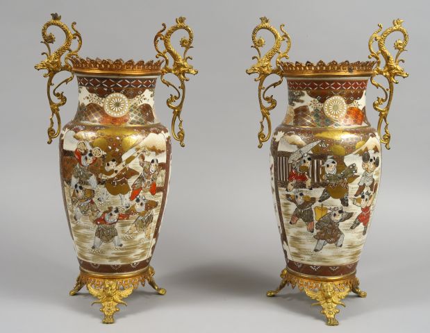 Paire de vases montés en céramique polychrome de Satzuma, monture laiton doré