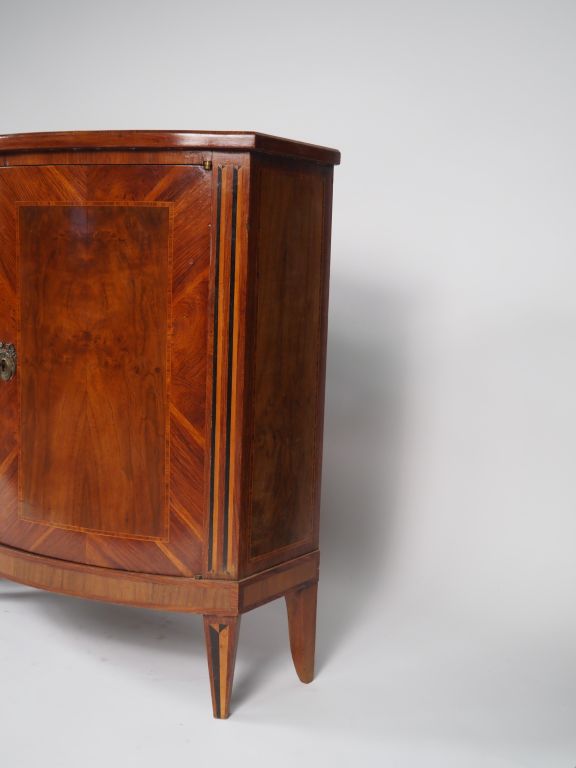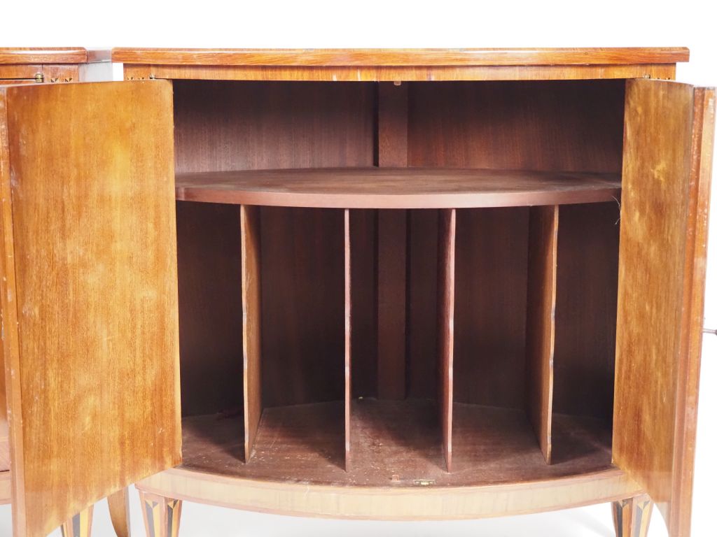 Paire d'encoignures de style Louis XVI en marqueterie à décor de cannelures en trompe l'œil, ouvrant à deux portes légèrement cintrées. H. 85 x 84 x 50 cm (quelques sauts de placage)