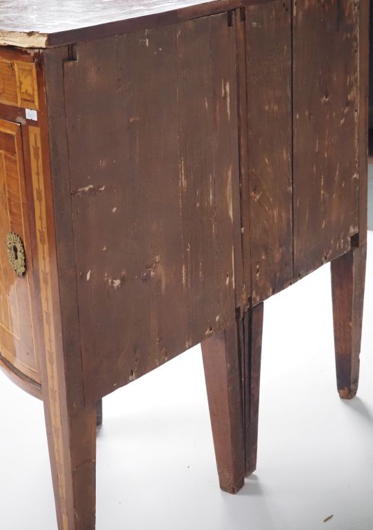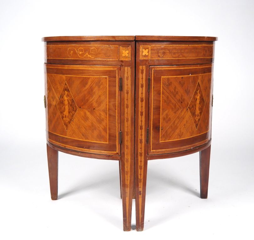 Paire d'encoignures italiennes XIXème en marqueterie, à décor dans des réserves de muses sur fond de fleur de Lys. Dim. 79,5 x 40,5 x 57 cm
