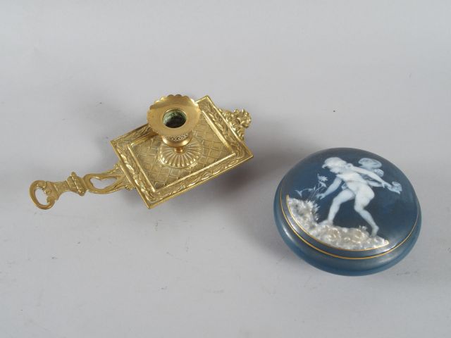 Passe-couloir en bronze de style Haute Epoque, boite 1900 en porcelaine de Limoges décor en bleu et blanc d'enfants
