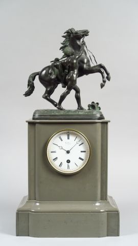 Pendule borne en marbre gris, mouvement pas Gillion à Orléans, surmontée d’une sculpture en régule d’après Coustou H. : 53 cm