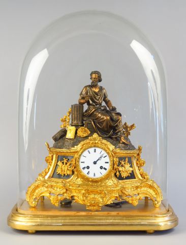 Pendule Napoléon III en régule patiné médaille et doré « Allégorie du théâtre », avec son globe H. : 40 cm