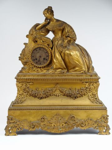 Pendule Restauration en bronze doré figurant une jeune femme romantique accoudée, mouvement signé Durand élève de Lepaute à Paris H. 60 cm