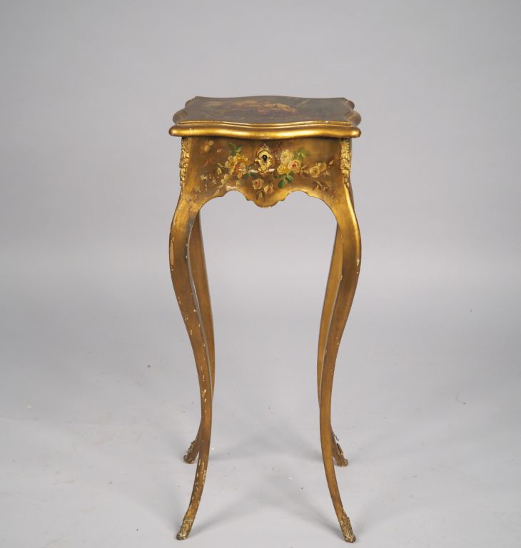 Petit table chiffonnier de style Louis XV, décor de jeune bergère en vernis martin. (petits accidents) Dim. 74 x 29 x 26 cm