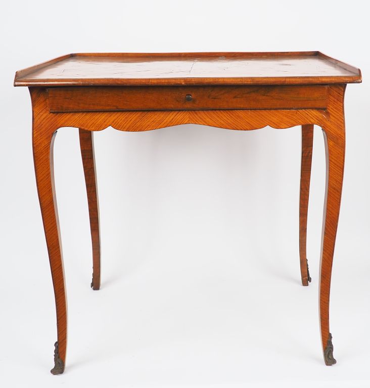 Petite table à écrire Louis XV, en placage de bois de rose et marqueterie, à décor de rinceaux feuillagés, ouvrant à un tiroir en ceinture, pieds cambrés. Dim. 72,5 x 74 x 57 cm (restaurations)