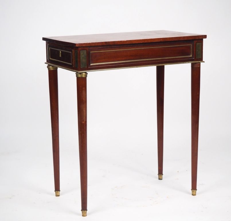 Petite table console de style Directoire en acajou et placage d'acajou, ornementation de laiton, pieds fuselés. Dim. 74,5 x 64,5 x 36,5 cm. ( plateau refait, manques, rayures)