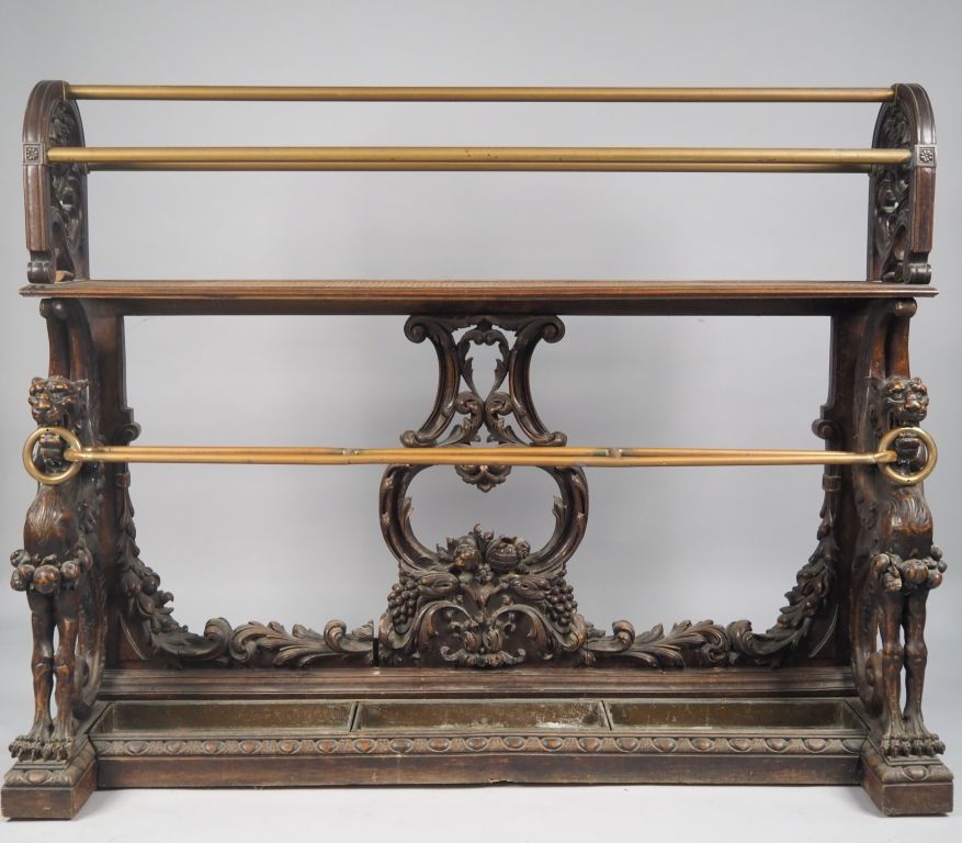 Porte vêtements et chapeaux de style Henri II en bois naturel mouluré et sculpté, à décor de chimères, de fruits et de feuillage. Porte chapeaux canné. Dim. 143 x 174 x 35 cm