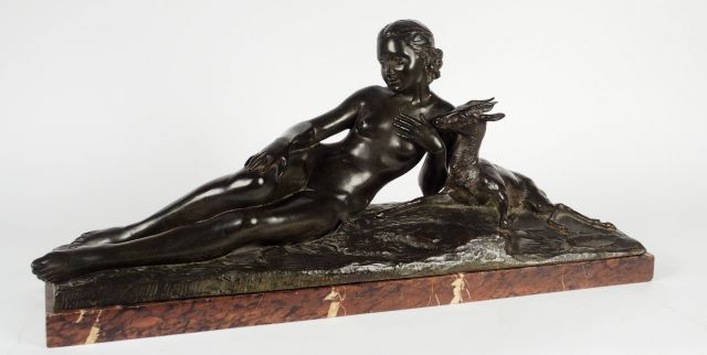 René PAPA. 'Jeune femme à la biche'. Sculpture en bronze à patine verte.Socle en marbre. Signée. 25 x 61 x 15,5 cm