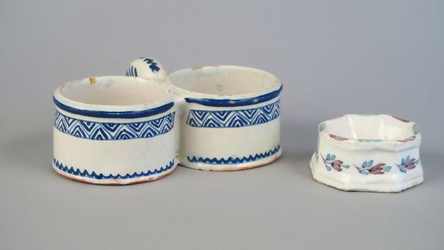 Lot de Saleron et monture d’huilier en faïence XIX ème au prix de 40 à 60 € en vente aux enchères par l'hôtel des ventes Primardeco