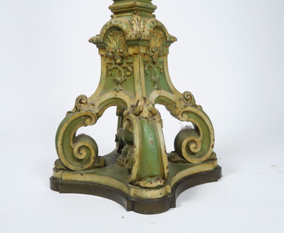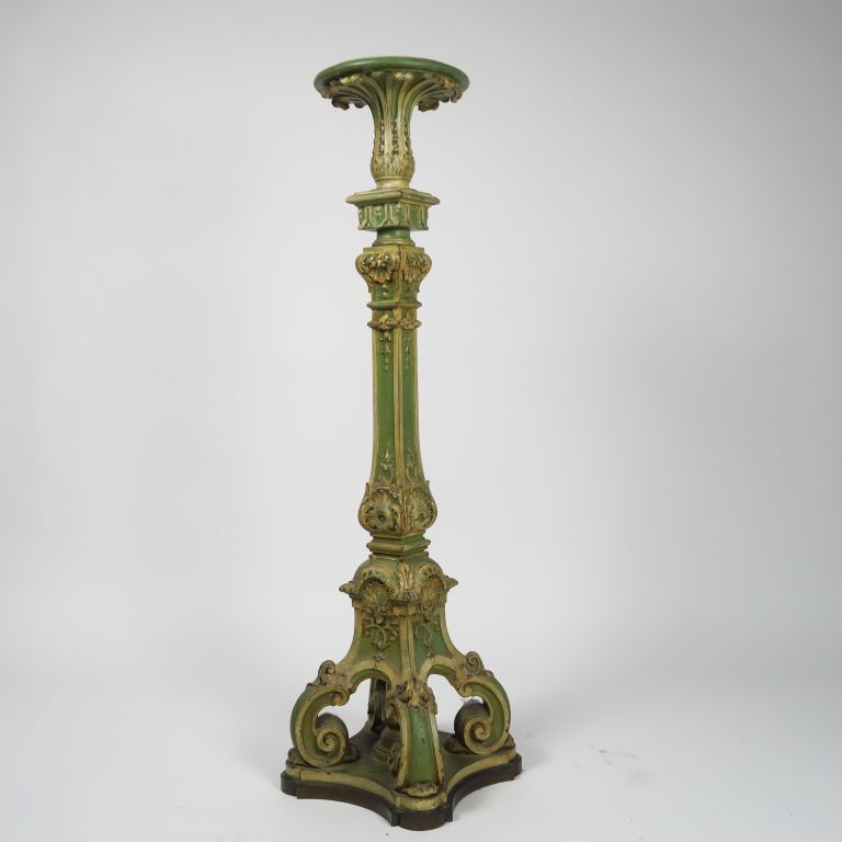 Sellette de style Louis XIV en bois sculpté et mouluré à décor de fleurons, de coquilles et de cannelures rudentées, laqué vert et blanc. H. : 127 cm.
