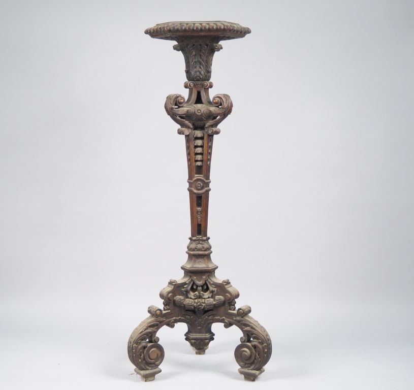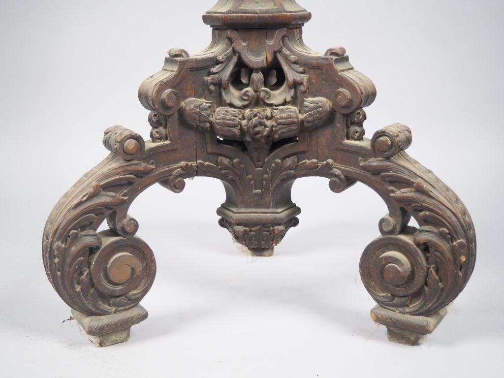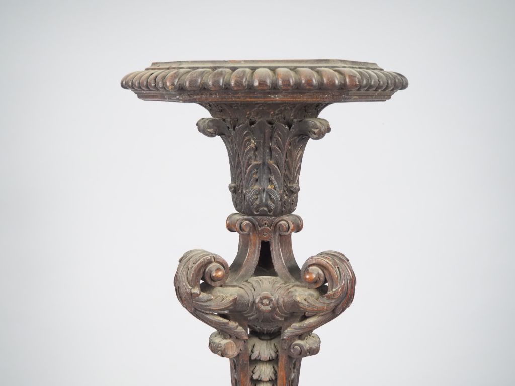 Sellette de style Louis XIV en chêne mouluré, sculpté et ajouré, à décor de feuillage et de consoles, piétement tripode. H. 155 cm