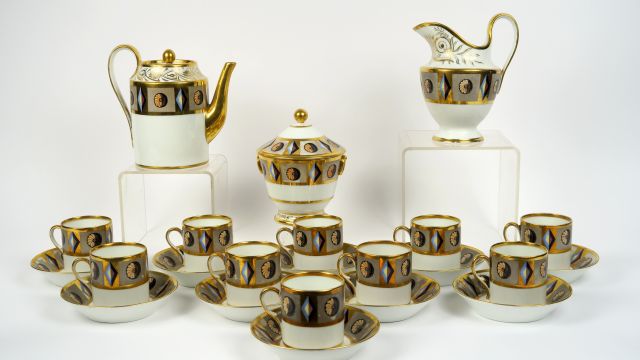 Service à café début XIX ème en porcelaine, à décor polychrome de cabochons en trompe l'œil. Comprenant : 3 pièces de forme, 10 tasses et sous-tasses. La cafetière portant une étiquette de la maison Darte à Paris.