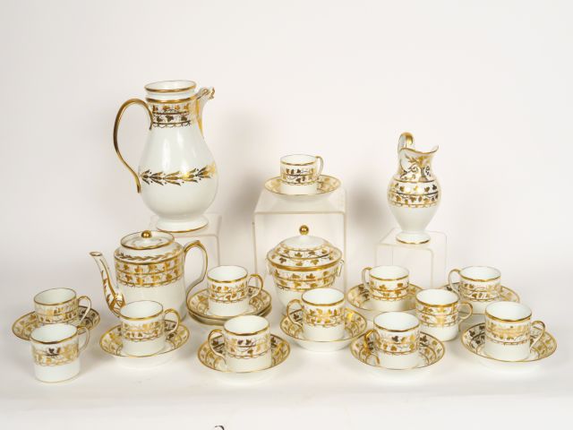 Service à thé et à café deuxième moitié XIXème en porcelaine blanche et dorée, à décor de pampres et de laurier. Comprenant : une cafetière (prise manquante), une théière, un pot à lait, un sucrier et douze tasses et leurs sous-tasses.
