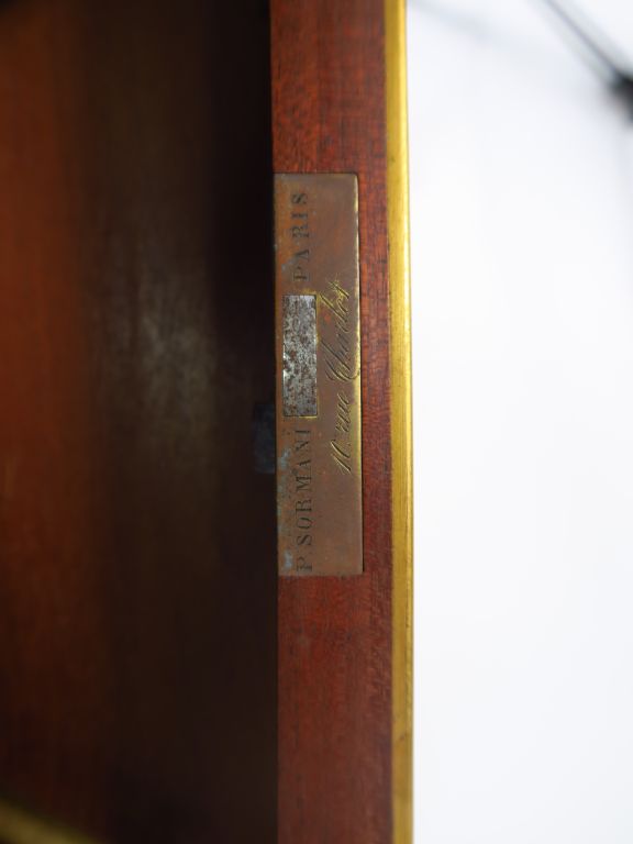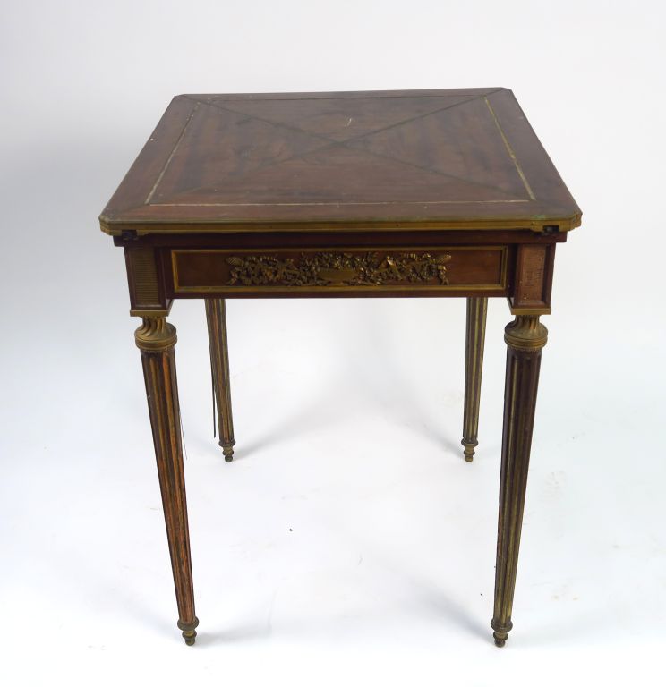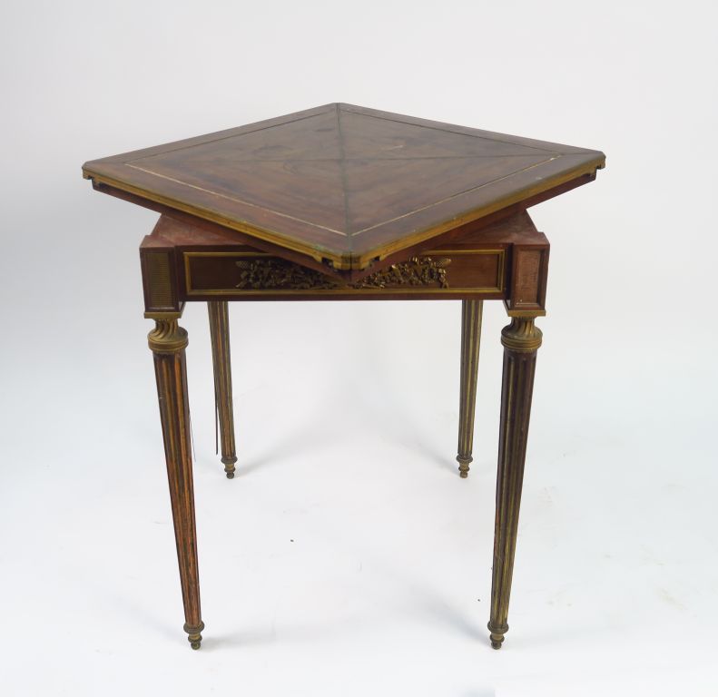 SORMANI. Table à jeux "portefeuille" en acajou, ornementation de bronze. Signée. Manques et accidents.