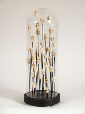 Sous son globe XIXe 'Memento mori'. Composition de têtes sculptées dans des bois de cervidés