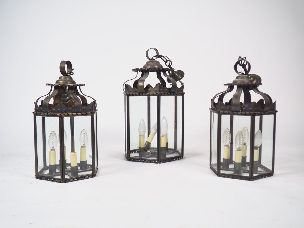 Suite de trois suspensions dont une paire en tôle et verre, éclairant à quatre lumières. H. 53 et 46 cm