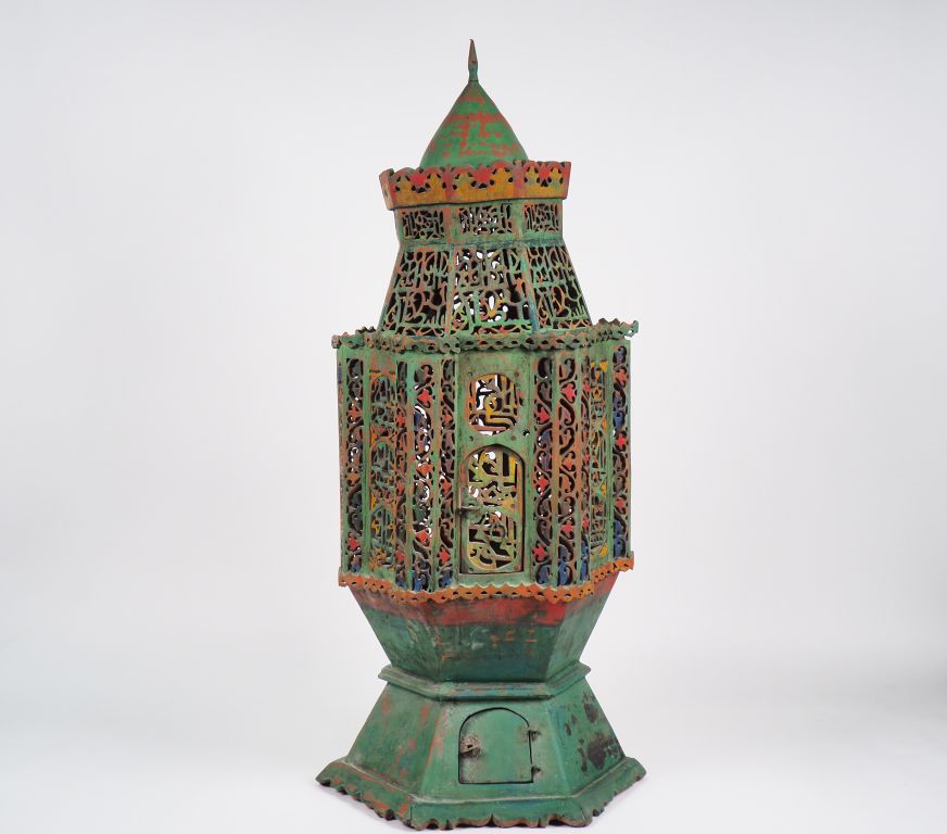 Superbe et grande lampe de mosquée ancienne en bois sculpté et ajouré à décor de rinceaux feuillagés polychromes. (accidents).