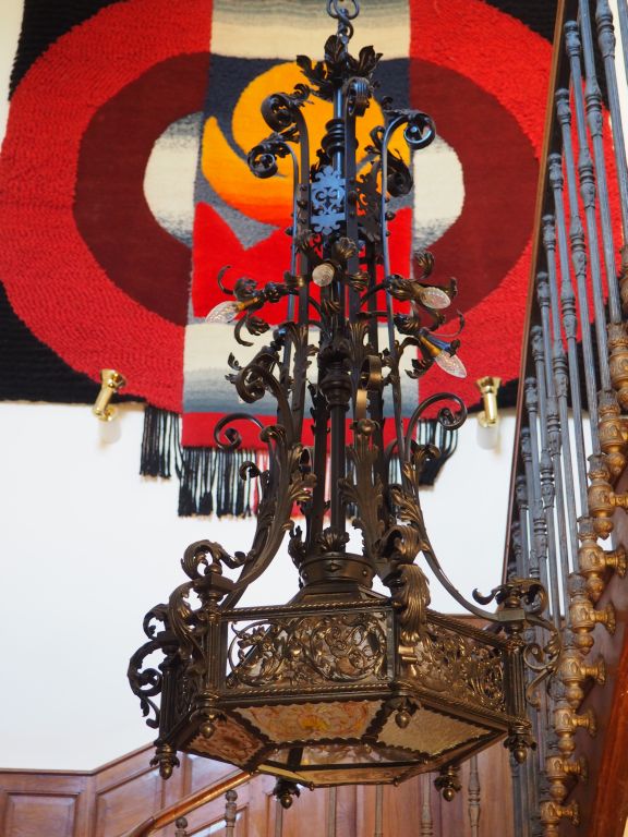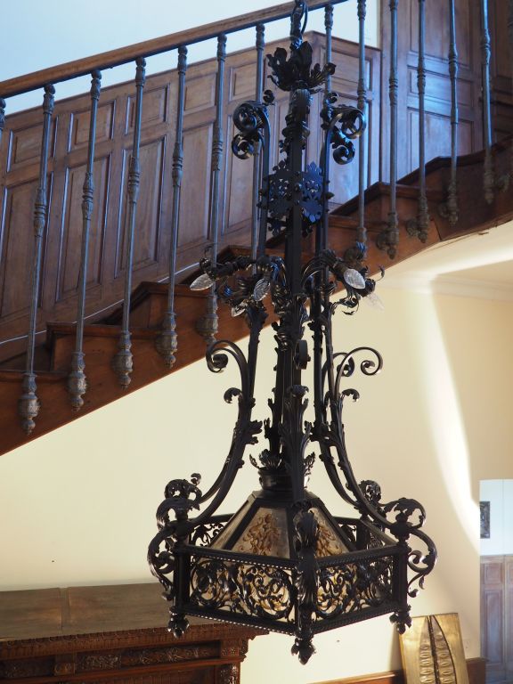 Suspension de style Haute-Epoque en fer forgé et tole laquée noir, à décor de rinceaux feuillagés de chimères et de feuilles d'acanthe, vitraux en camaieu ocre éclairant à neuf lumières. H. 145 cm.