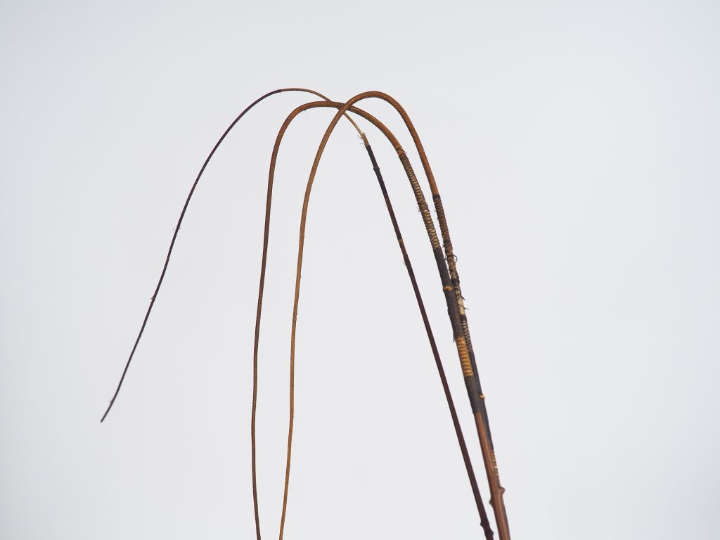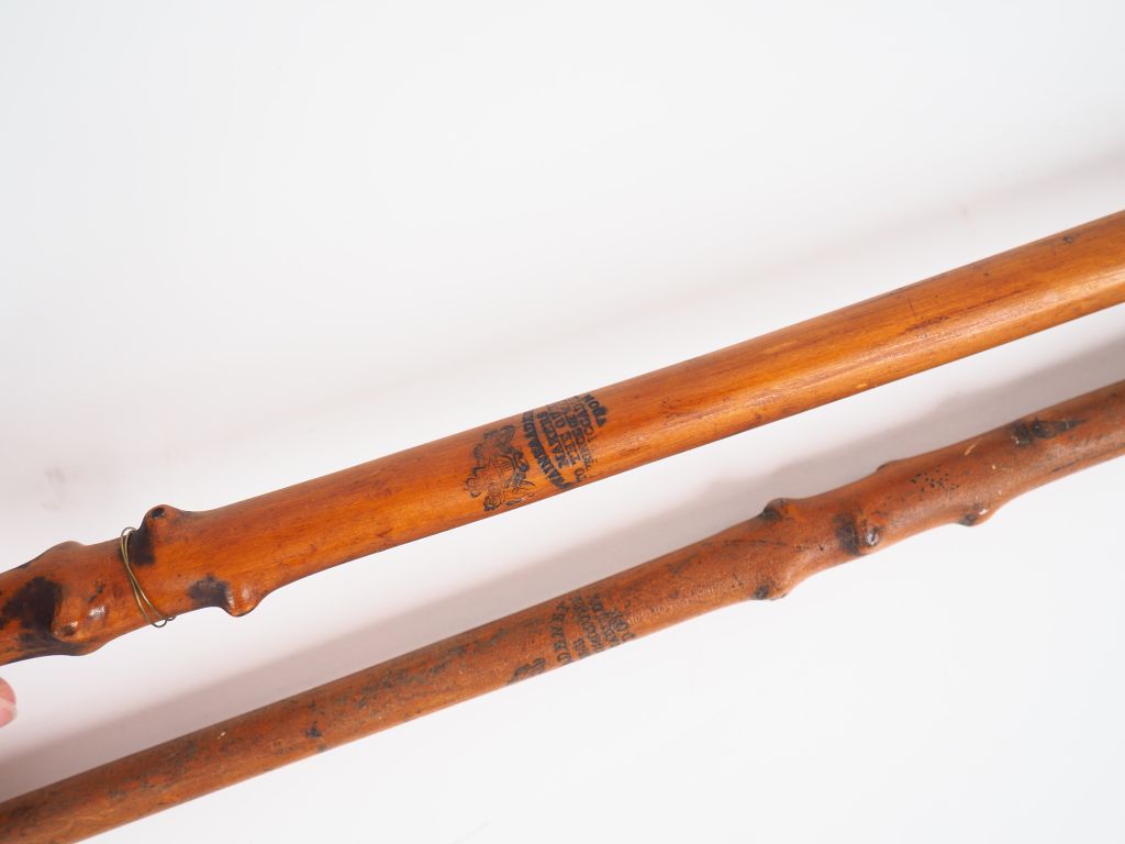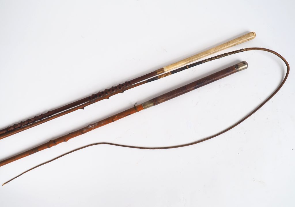 SWAINE ADENEY. 2 fouets de cocher en bois, cuir et métal argenté. Signés Swaine Adeney makers to the Queen, prince of Wales, Picadilly London. On y joint un fouet anglais. Dim. 270 cm. Dim. 290 cm. Dim. 240 cm.